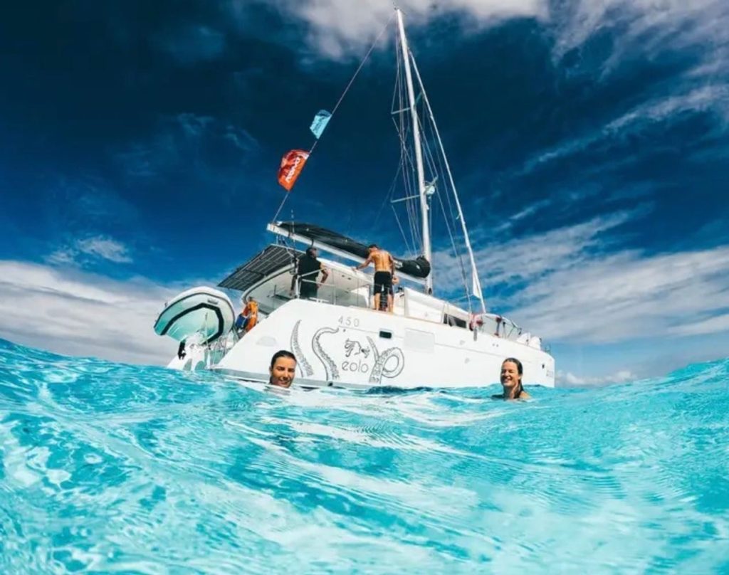 We sail a Lagoon 450 catamaran: stable, spacious, and well-equipped. You’ll share a cabin with one other crew member, each with its own bathroom. Space is comfortable but still a boat. Water and power come from watermakers and solar panels. Meals are shared and included: fresh, simple, provisioned locally. This is not a luxury charter. It’s a hands-on, team-based way of travelling. Everyone helps with sailing, cooking, and daily life onboard.